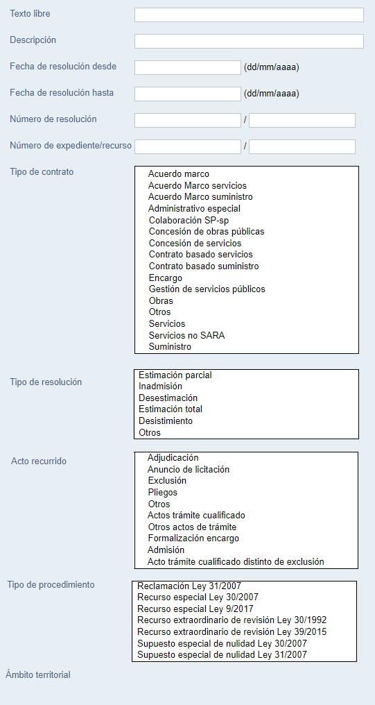 El campo «Ámbito territorial» recoge la regiones que han firmado un convenio con la Administración General del Estado para atribuir al TACRC la competencia de gestionar los recursos y reclamaciones derivados de contratos públicos en dichos territorios. Aquellas autonomías que no hayan firmado un convenio tienen sus propios tribunales administrativos de contratación pública (TACP).