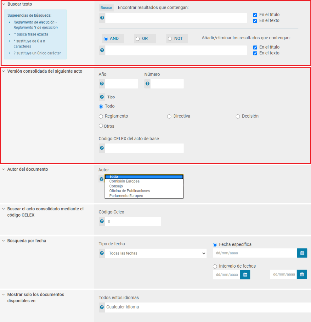 He enmarcado en rojo aquellos campos más útiles para hacer una búsqueda. No obstante, si disponéis de la numeración oficial de la norma original (acto de base), no lo dudéis, usad el campo «Versión consolidada del siguiente acto» para obtener un solo resultado.