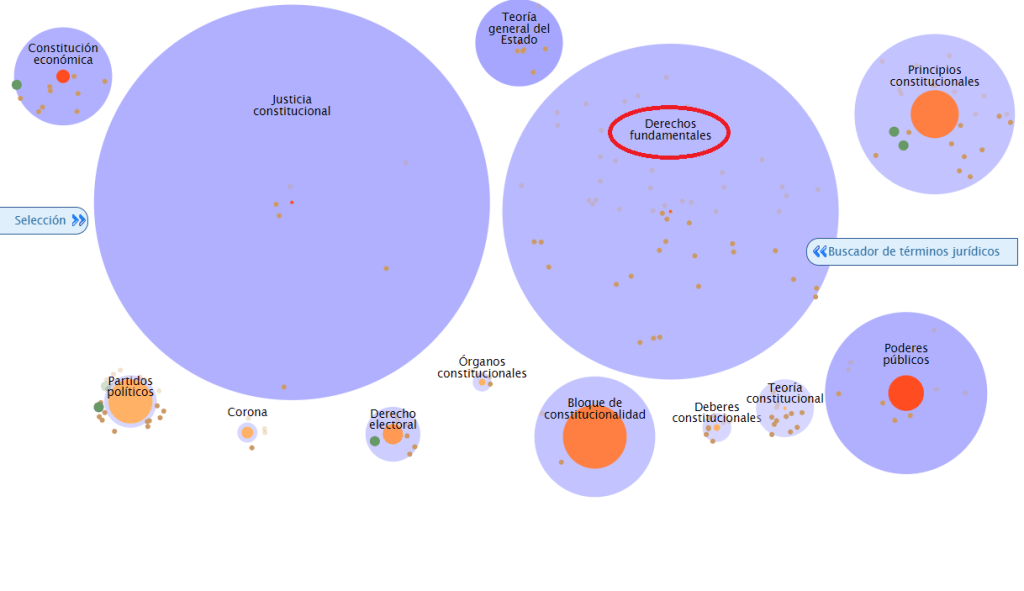Sin embargo, si seleccionamos la Ontología semántica nos aparecen de nuevo los mismos conceptos en forma de círculos, a través de los cuales navegaremos para identificar el descriptor que necesitamos. Vamos a realizar una búsqueda similar a la que hicimos en el tesauro, pero esta vez, pulsaremos primero «conceptos constitucionales«, que nos abrirá otra red de segundo nivel: