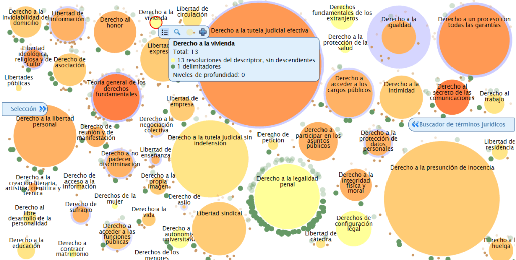 Al elegir el concepto «derechos fundamentales» se nos abrirá otra red de tercer nivel. En la imagen veremos que nos encontramos ante un sistema mucho más visual en donde aparecen representados todos aquellos derechos fundamentales. Si nos situamos encima de los círculos, nos aparece una leyenda informando de la composición del descriptor: resoluciones con/sin descendientes, términos específicos, delimitadores y el número de niveles que todavía puede llegar a desarrollar el concepto.