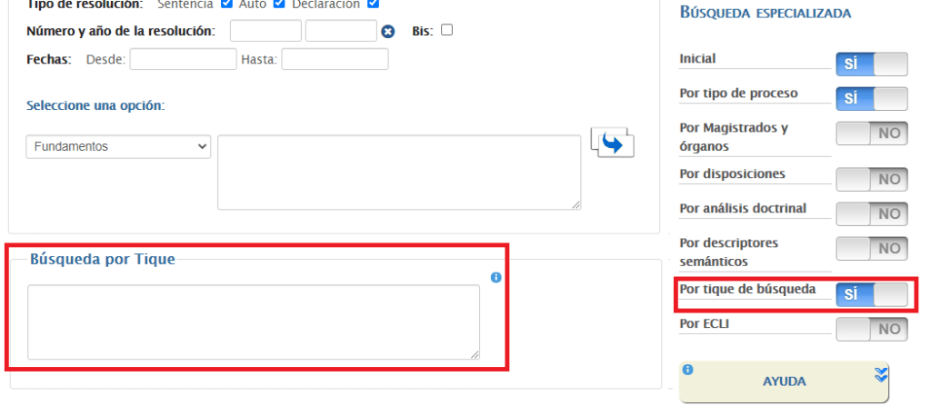 Dicho código lo podremos utilizar en el buscador de la base de datos jurisprudencial, seleccionando la opción «Por tique de búsqueda«: